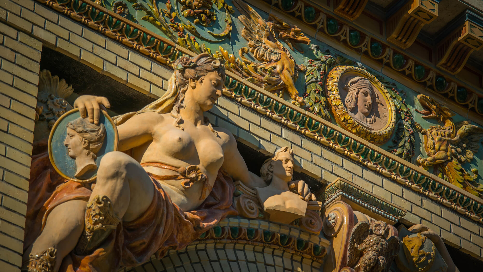 It is worth spending some time inside the House of the Hungarian Millennium too to see its Zsolnay decorations. You will find Renaissance motifs, faun heads reminiscent of medieval churches as well as Egyptian and Greek female figures, but if you look closer, you can discover Persian winged lions on the ornate façade. You can also notice portraits of the three great Renaissance geniuses – Leonardo, Raphael and Michelangelo – pop up here and there among the scroll-leaf decorations, vases with dragons and winged lions.